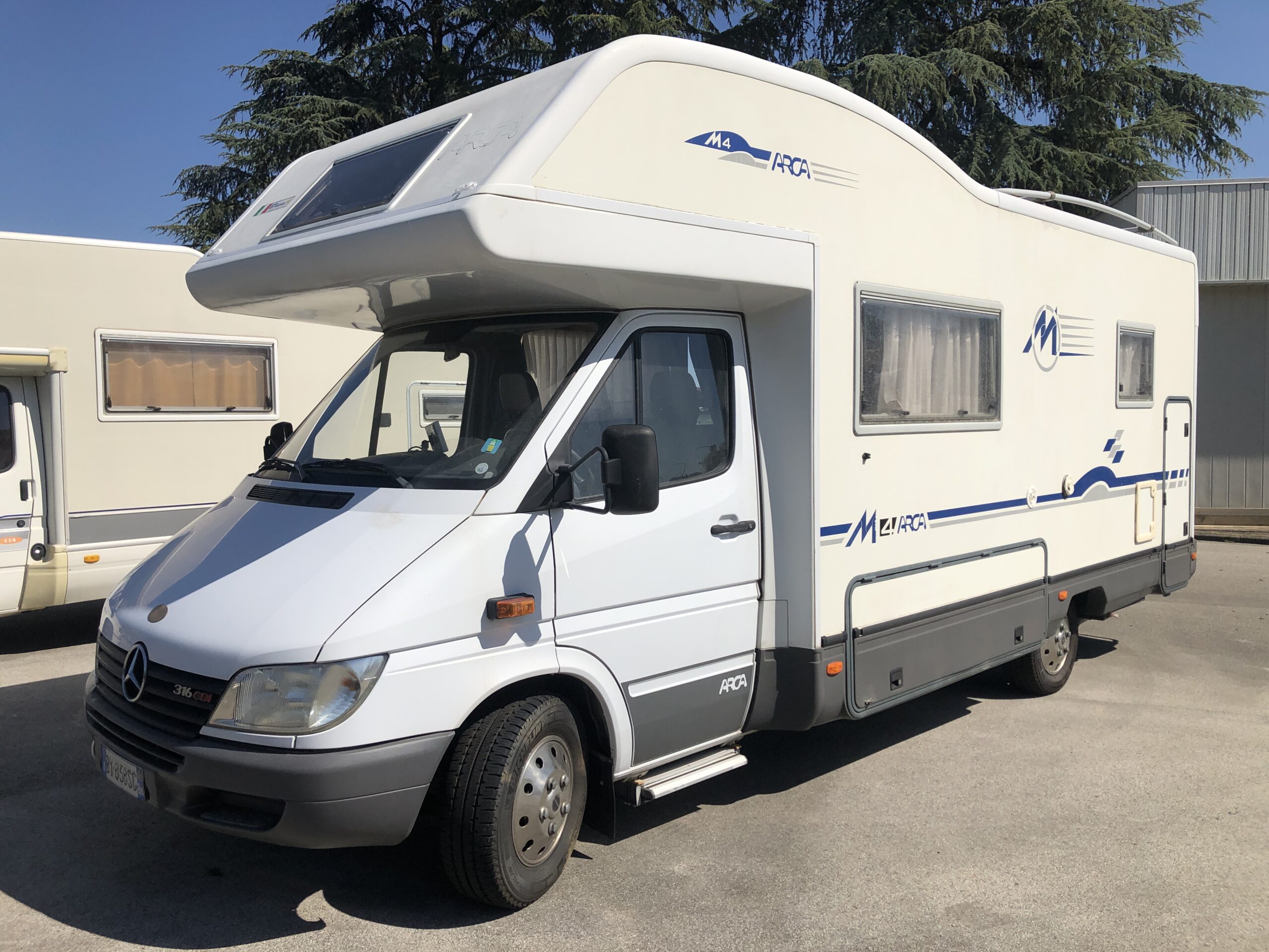 Arca M4 mansardato 6 posti letto, in ottime condizioni sia esternamente sia internamente, sempre tenuto al coperto, ha un matrimoniale in mansarda, un lettino posteriore, un divano trasformabile in letto singolo e una dinette matrimoniale.