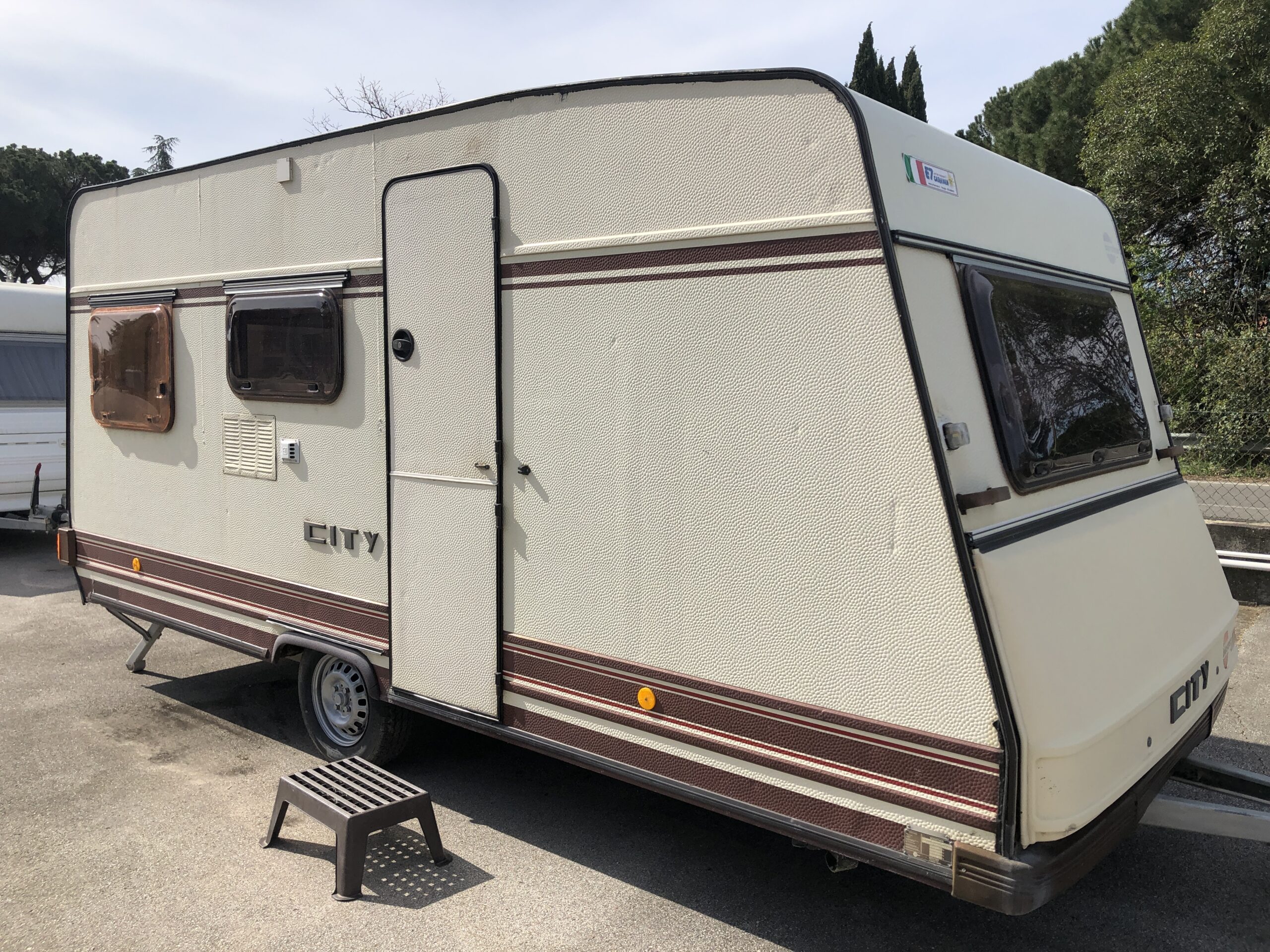 Roulotte Bürstner City 450, anno 1985, in buone condizioni. Cinque posti letto, dinette matrimoniale, letto a castello. Con veranda e cucinotto.