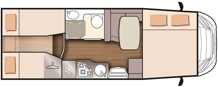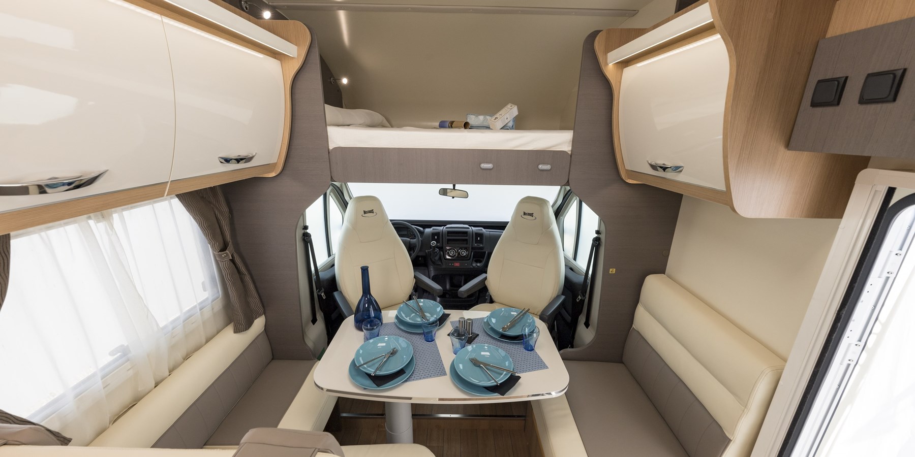 Il camper McLouis Glamys 365 ha letti gemelli posteriori, un matrimoniale in mansarda e una dinette trasformabile in un posto letto singolo.
