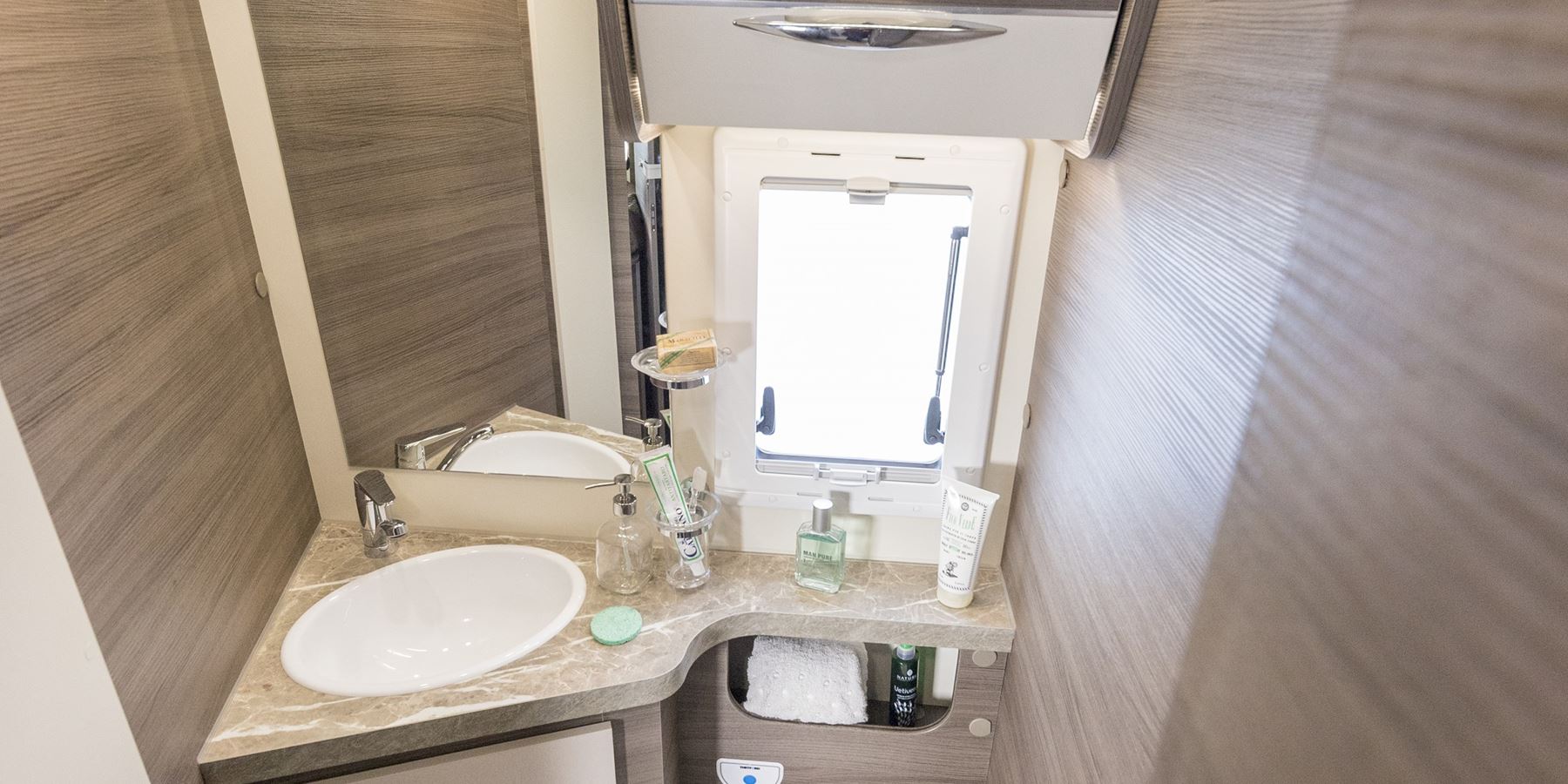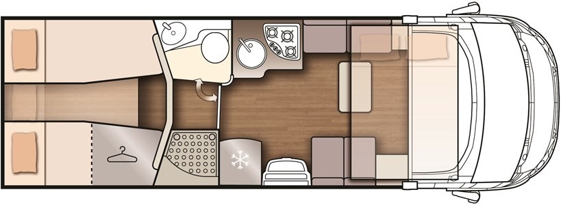 Il Motorhome McLouis Nevis 870 con letti gemelli posteriori e letto matrimoniale basculante sulla cabina di guida e ampia dinette face to face. Il bagno e la doccia sono separati.