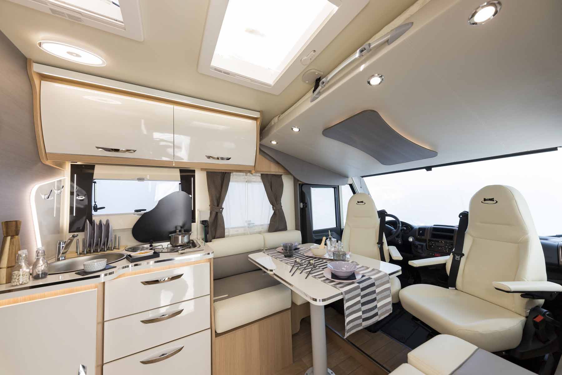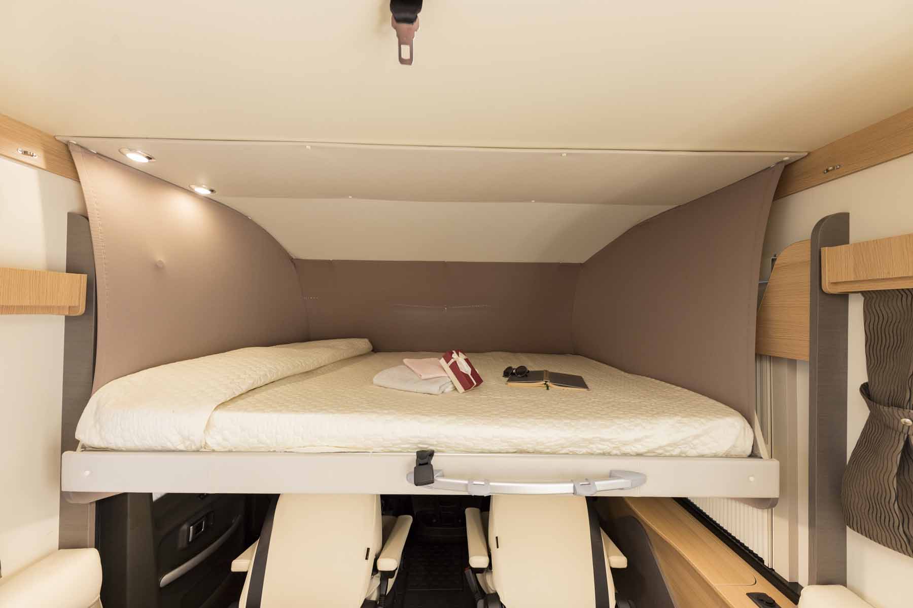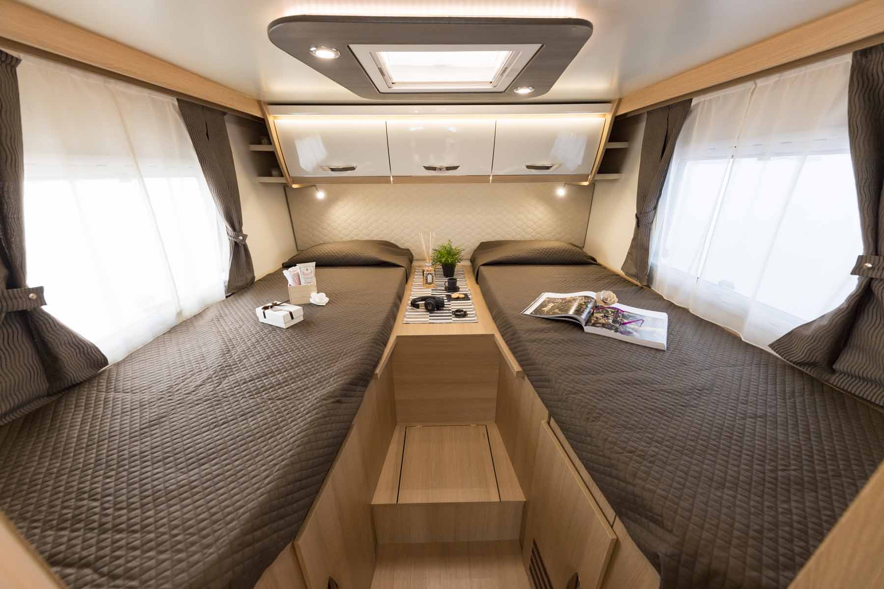 Il Motorhome McLouis Nevis 370 ha due letti gemelli nella parte posteriore e un basculante matrimoniale anteriore (che lascia parzialmente libera la dinette e completamente libera la porta d’ingresso).