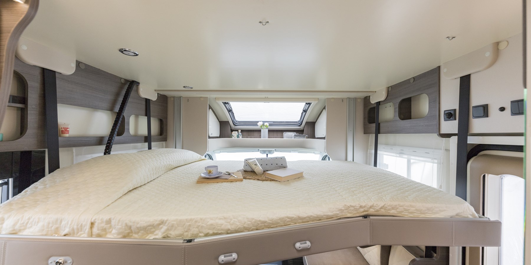 Il semintegrale McLouis 881 ha un letto nautico molto spazioso posteriore, oltre ad un letto matrimoniale basculante nella parte anteriore ed una dinette trasformabile in un ulteriore letto singolo.