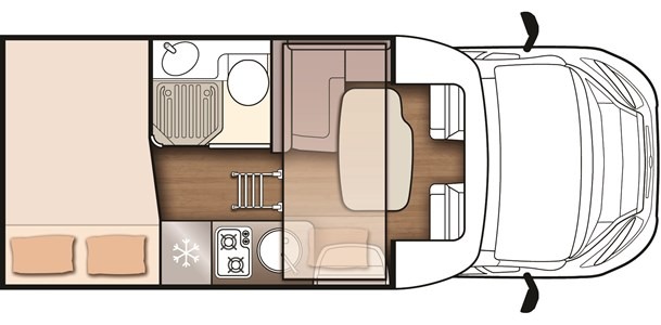 Camper semintegrale McLouis Mc4 831, concentra in meno di 6 metri tutto l’equipaggiamento tipico di un camper completo: un letto matrimoniale trasversale posteriore, un letto basculante singolo sopra una dinette trasformabile in letto singolo.