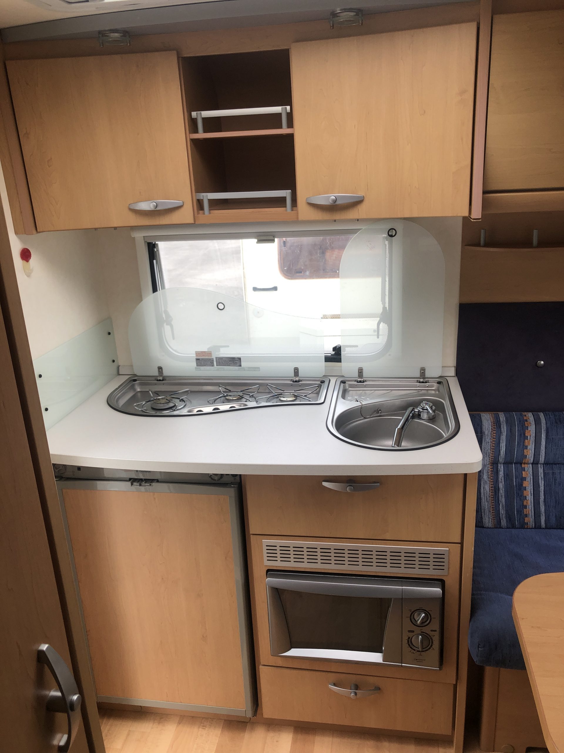 Caravan Knaus Sudwind Azur ha 4 posti letto, con una dinette trasformabile in comodo letto matrimoniale ed un letto matrimoniale alla francese. La roulotte è dotata di una cucina completa, lavello fornello frigo e forno a microonde, bagno con piatto doccia e wc a cassetta estraibile, boiler per acqua calda, oscuranti e zanzariera su tutte le finestre, porta scuderia con zanzariera integrale, stufa di riscaldamento termoventilata, portabombole frontale integrato, portabiciclette sul timone, stabilizzatore Aks AlKo, veranda esterna.