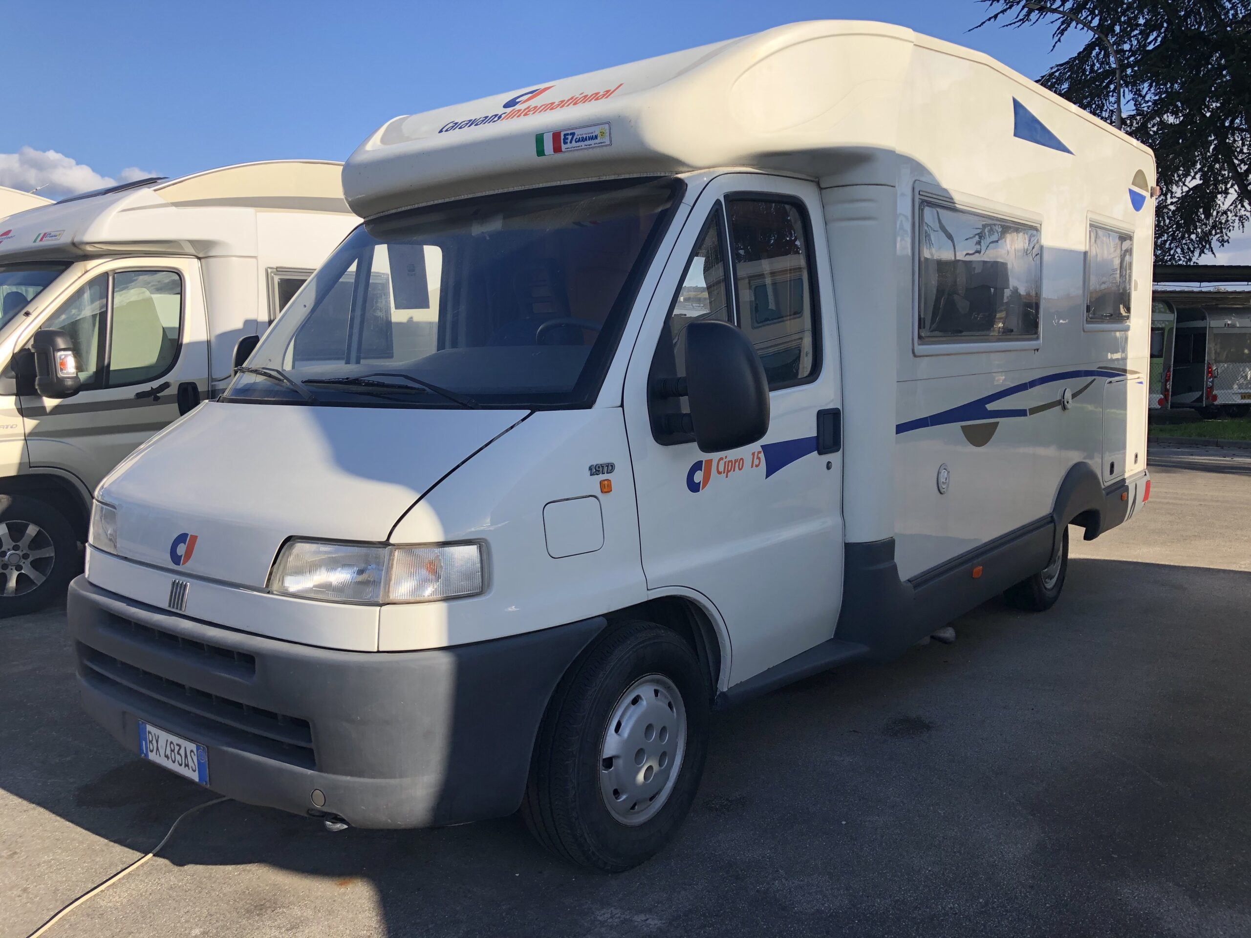 Caravans International Cipro 15 è un semintegrale in ottime condizioni, con un motore Fiat ducato 1.9 td, immatricolato nel marzo 2003 e con poco più di 80.000 km. I posti letto omologati sono 4 così come i posti letto, per una lunghezza assai contenuta di 617 cm ( una larghezza di 222 cm).