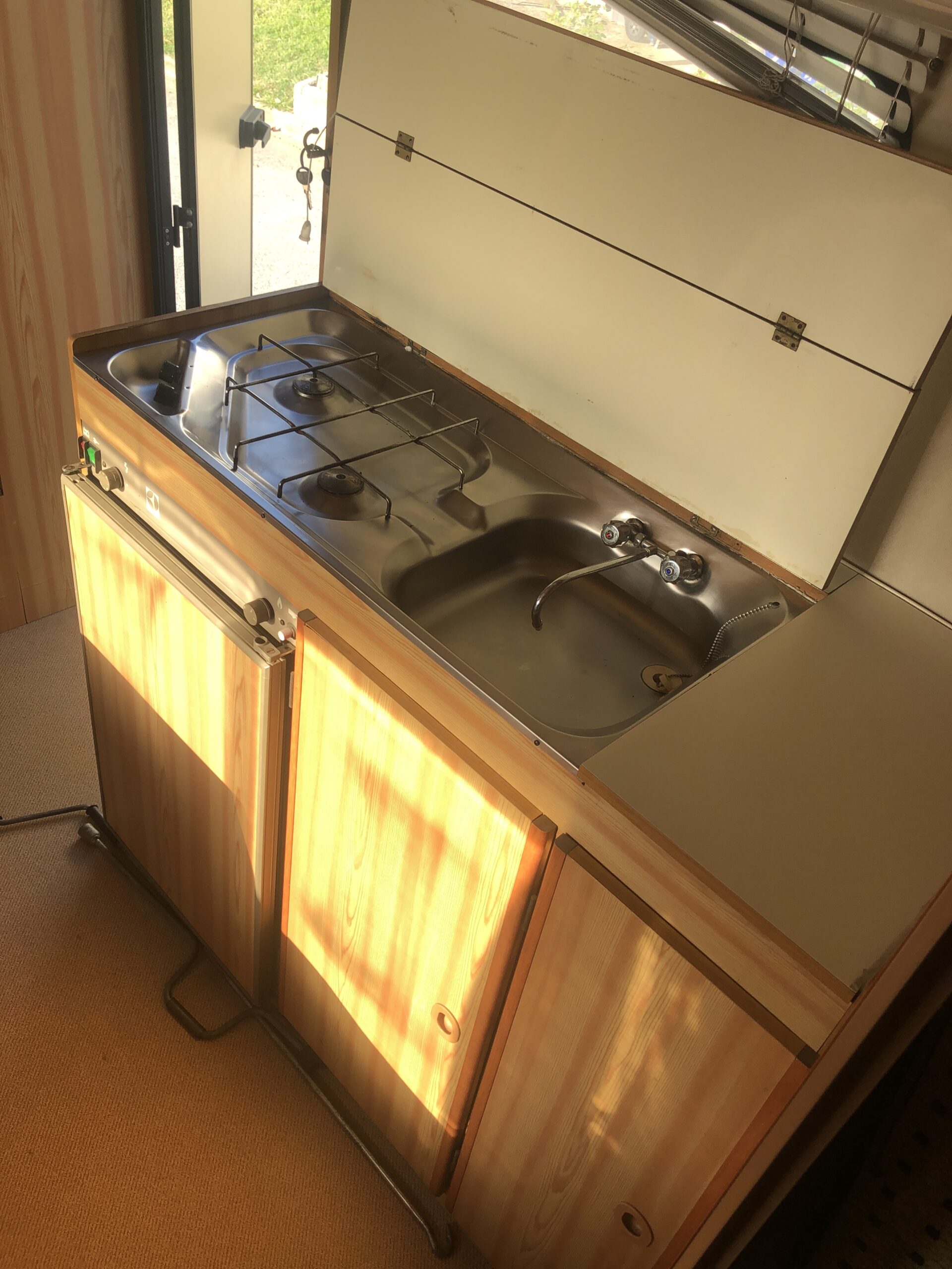 È dotato di portabici, bagno con doccia interna, riscaldamento tramite stufa a gas. In cucina ci sono 2 fuochi, lavandino e frigorifero. Grandi spazi di rimessaggio, compresi due blocchi di cassetti.