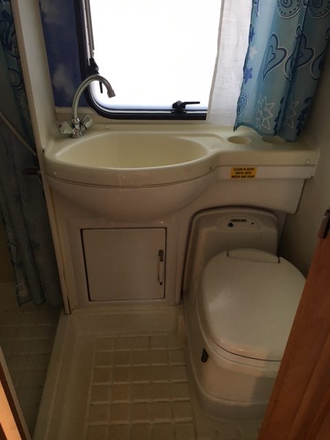 Il bagno situato nella parte posteriore destra del veicolo è molto ampio ed ha un doppio piatto doccia ( chiusura/separazione della cabina doccia con tenda in tessuto ).