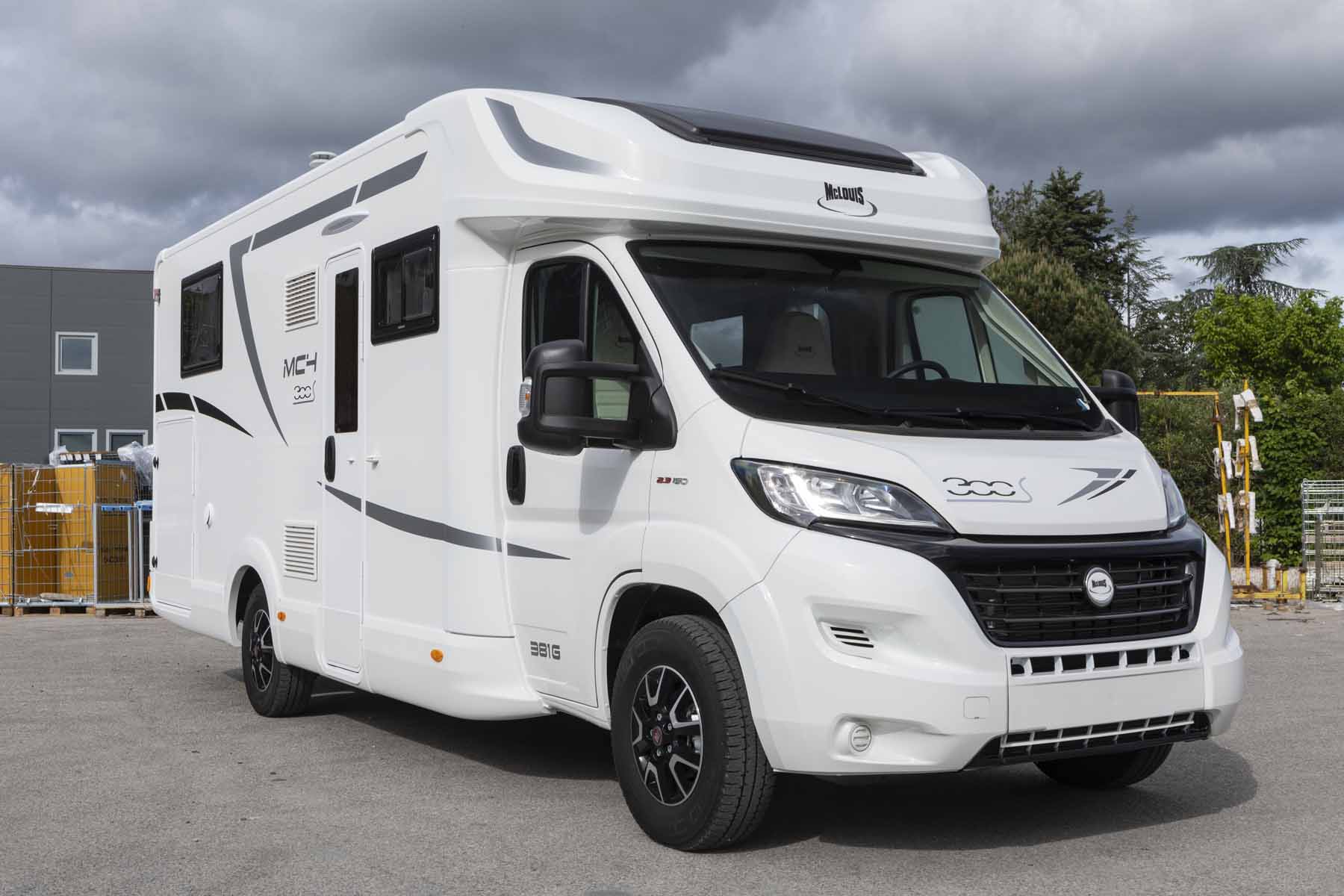 McLouis Mc4 381 semintegrale ha il letto matrimoniale nautico posteriore, il bagno separato dalla doccia ed un letto basculante matrimoniale centrale.