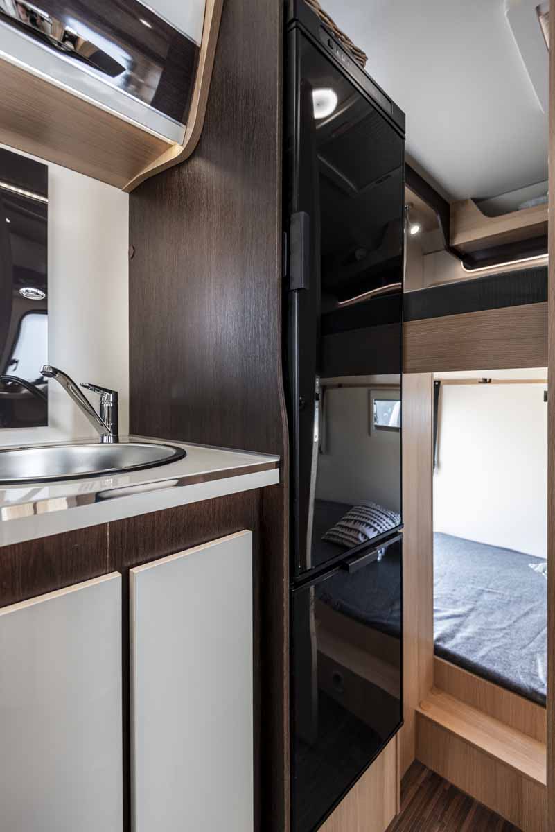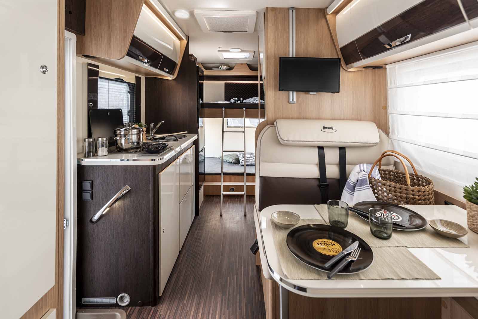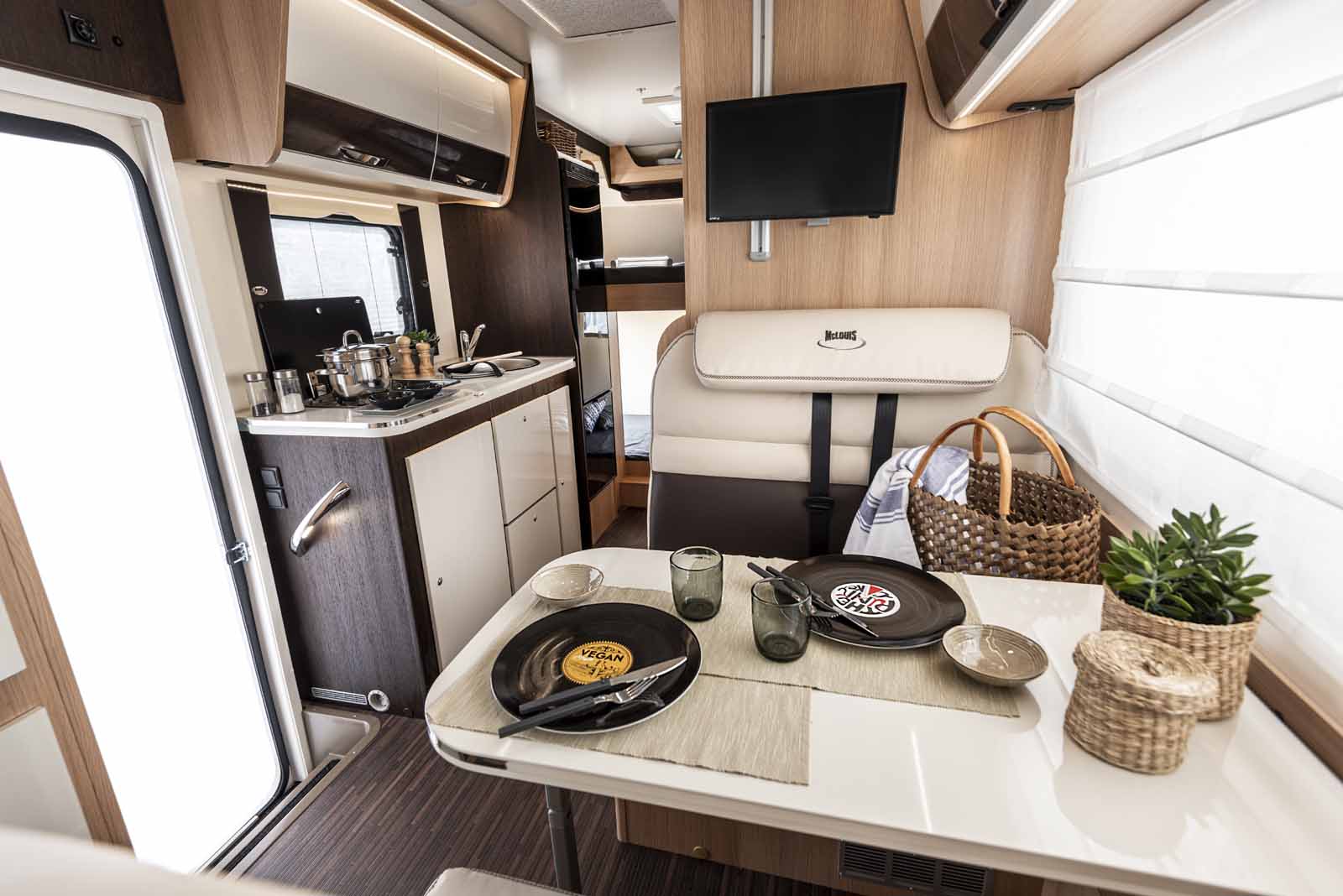 Il McLouis Glamys 220 mansardato stagione 2021 ha 8 posti letto (n. 2 matrimoniali a castello trasversali posteriori, il matrimoniale in mansarda e la dinette trasformabile in ulteriore matrimoniale), il bagno con la doccia interna separate una cucina completa, con frigo trivalente da 142 litri.