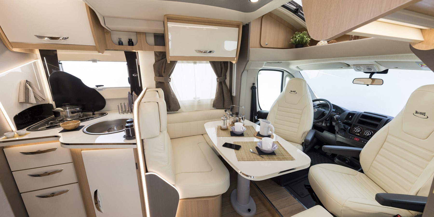 Spazioso il letto nautico posteriore, con accesso da ambo i lati, due armadi capienti e spazi di rimessaggio sotto la struttura del letto. Completano la fornitura di posti letto del McLouis Mc4 367 un matrimoniale basculante e una dinette singola, per un totale di 5 posti letto (4 con utilizzo contemporaneo della dinette). Il bagno è separato dalla doccia e la cucina è molto capiente.
