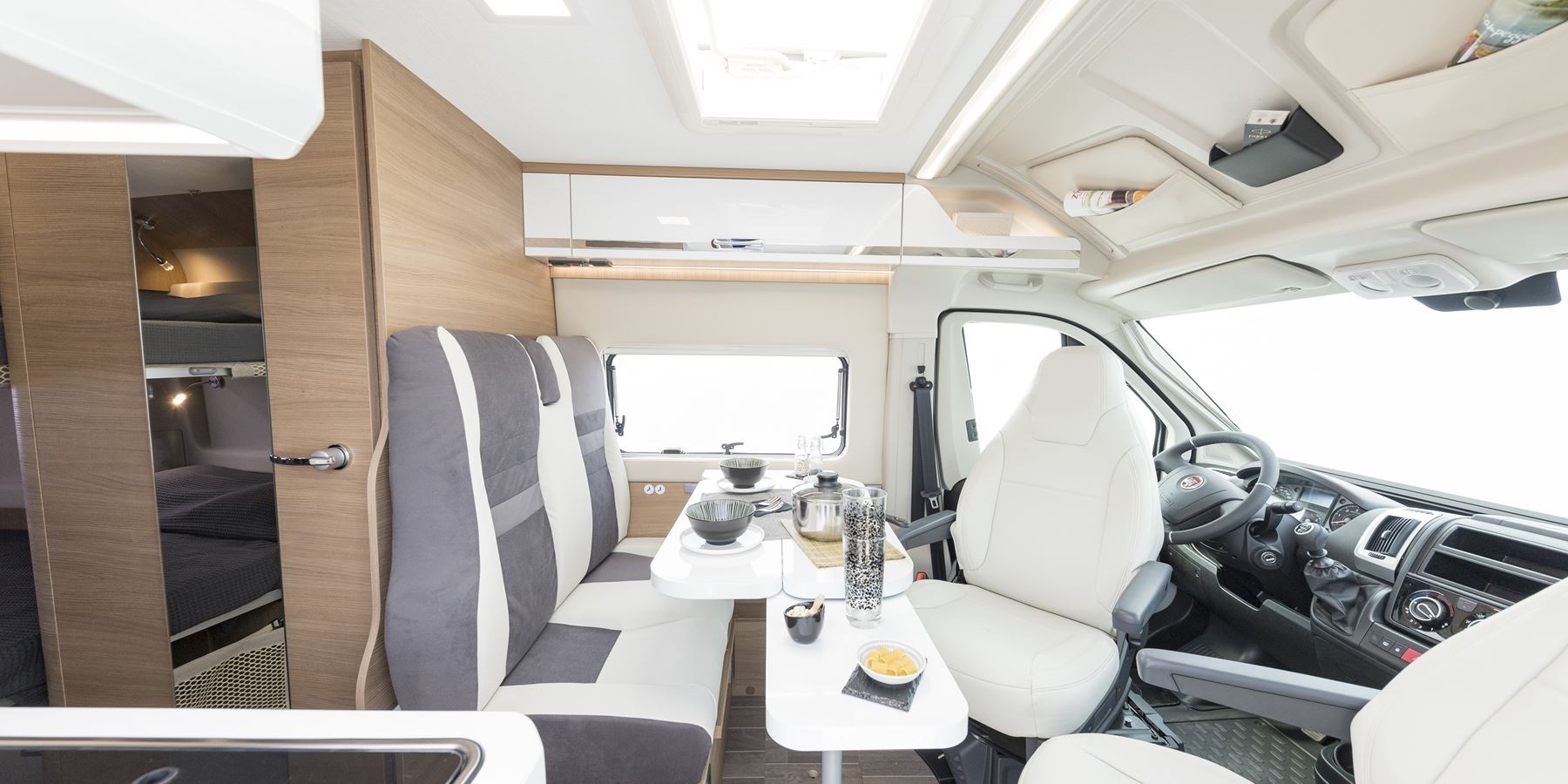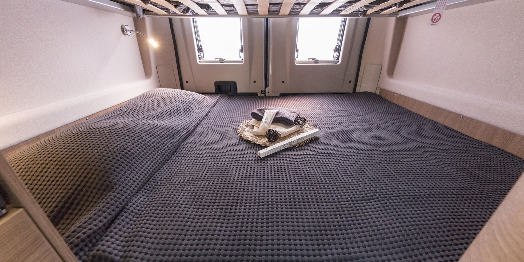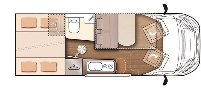 In meno di 6 metri trovano posto addirittura due matrimoniali posteriori trasversali, un bagno con doccia interna separata, una cucina con 2 fuochi ed un frigorifero verticale trivalente da 80 litri.