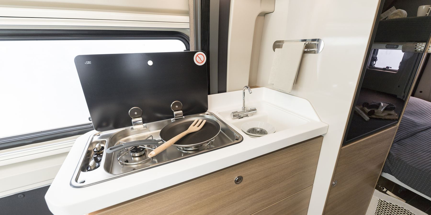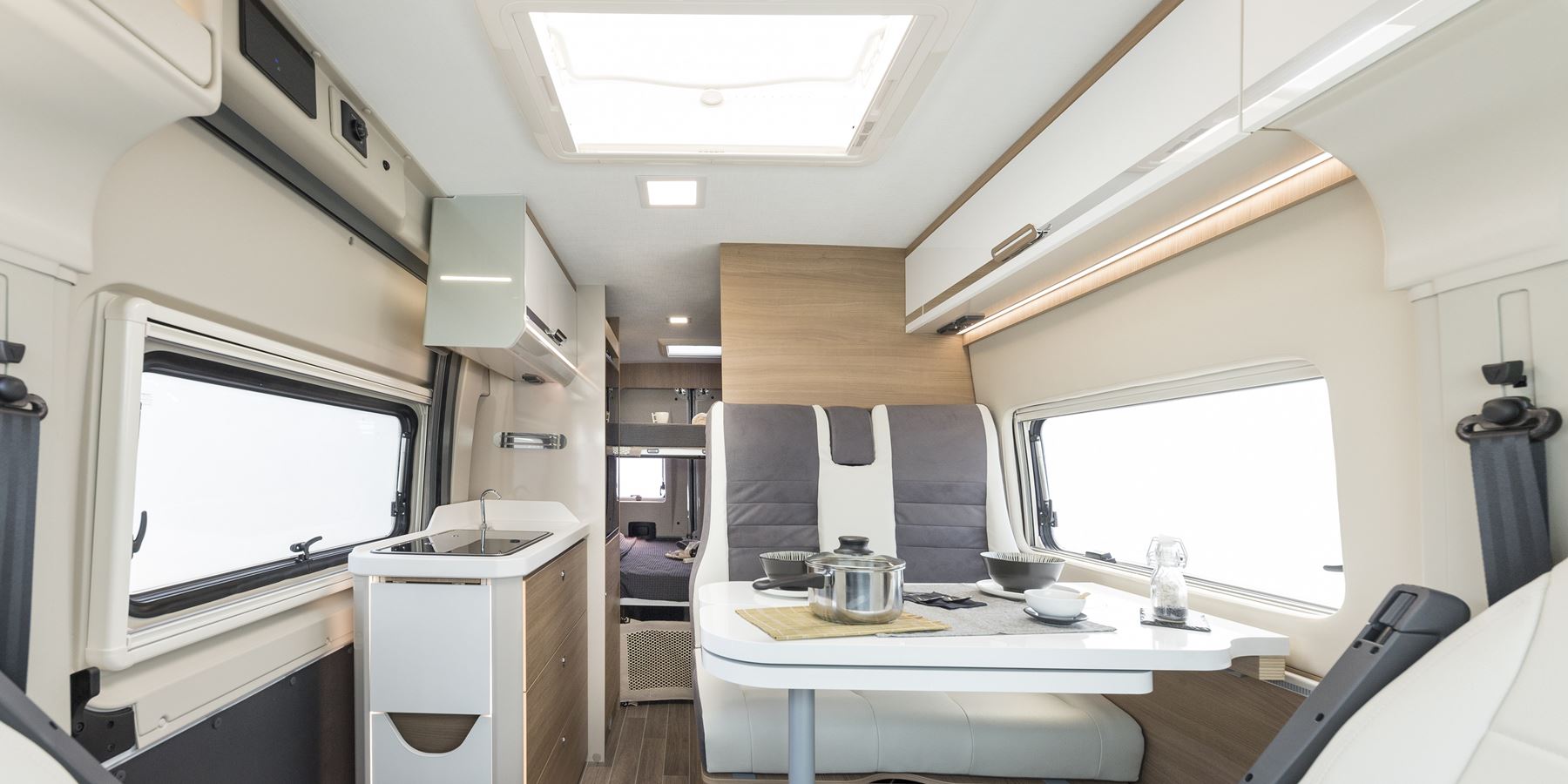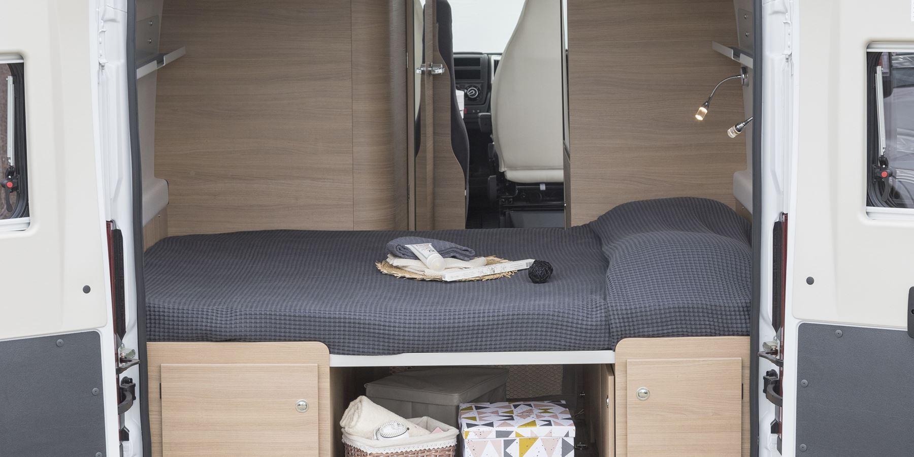 Il furgonato ultra compatto che può girare tranquillamente in città e parcheggiare sui posti auto, con la razionalizzazione perfetta degli spazi interni: in meno di 6 metri trovano posto addirittura due matrimoniali posteriori trasversali, un bagno con doccia interna, una cucina con 2 fuochi ed un frigorifero verticale trivalente da 80 litri.