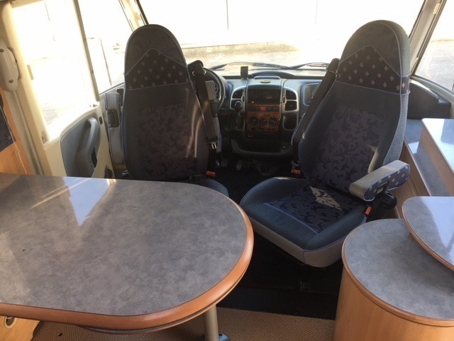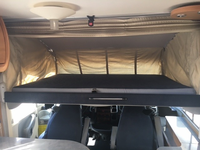 Il letto nel motorhome scende sopra la zona guida cosi da lasciare libero il tavolo della dinette.