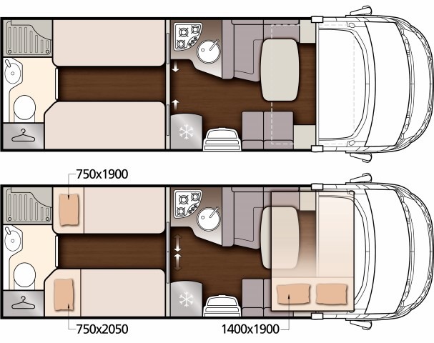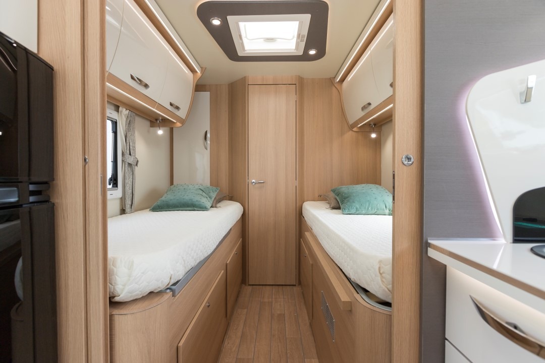 Il Motorhome McLouis Nevis 373 ha due letti gemelli nella parte posteriore e un basculante matrimoniale anteriore (che lascia parzialmente libera la dinette e completamente libera la porta d’ingresso). Il bagno è molto spazioso, con una doccia interna separata. La cucina ha 3 fuochi ed un frigorifero da 142 litri.