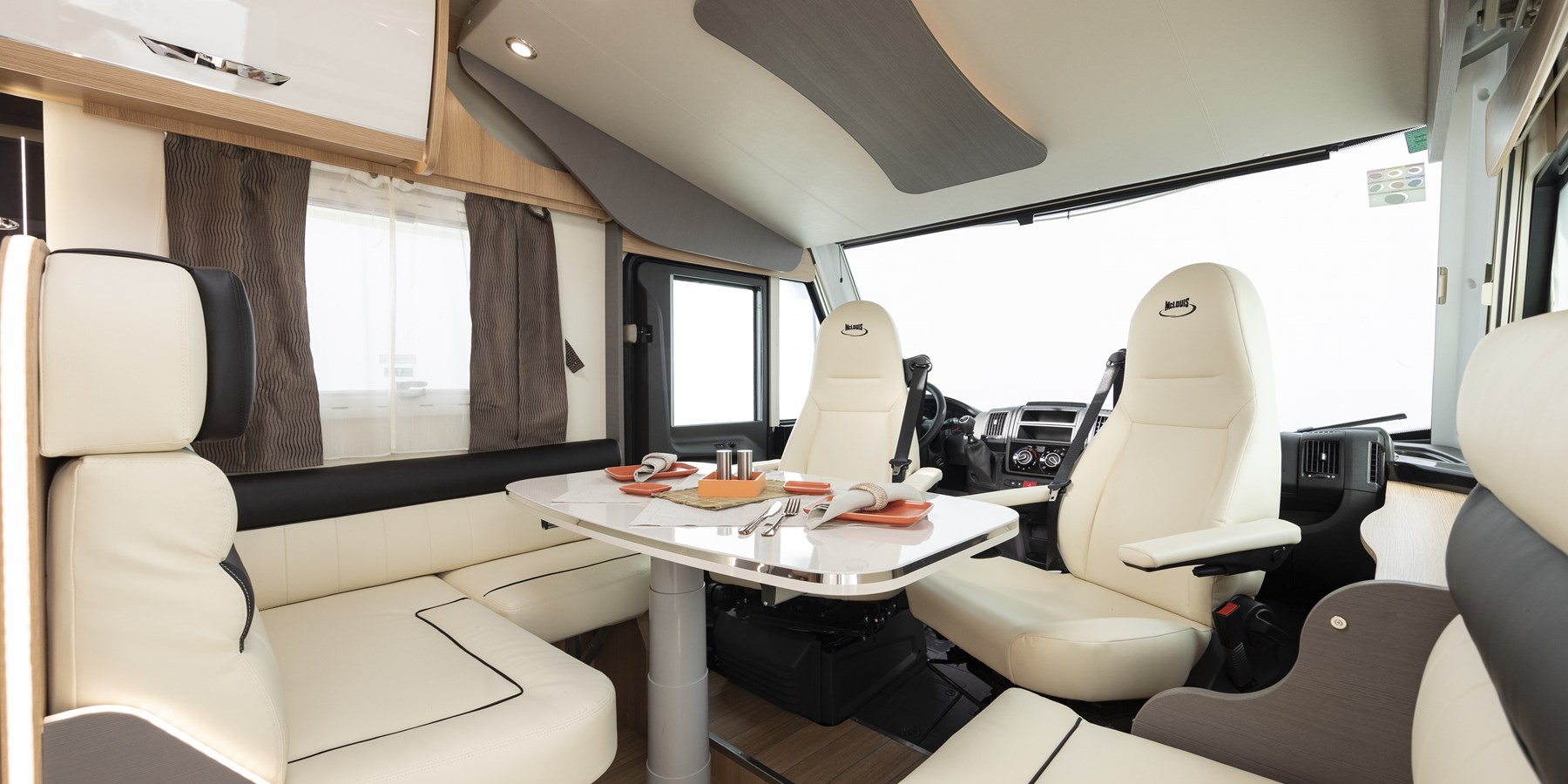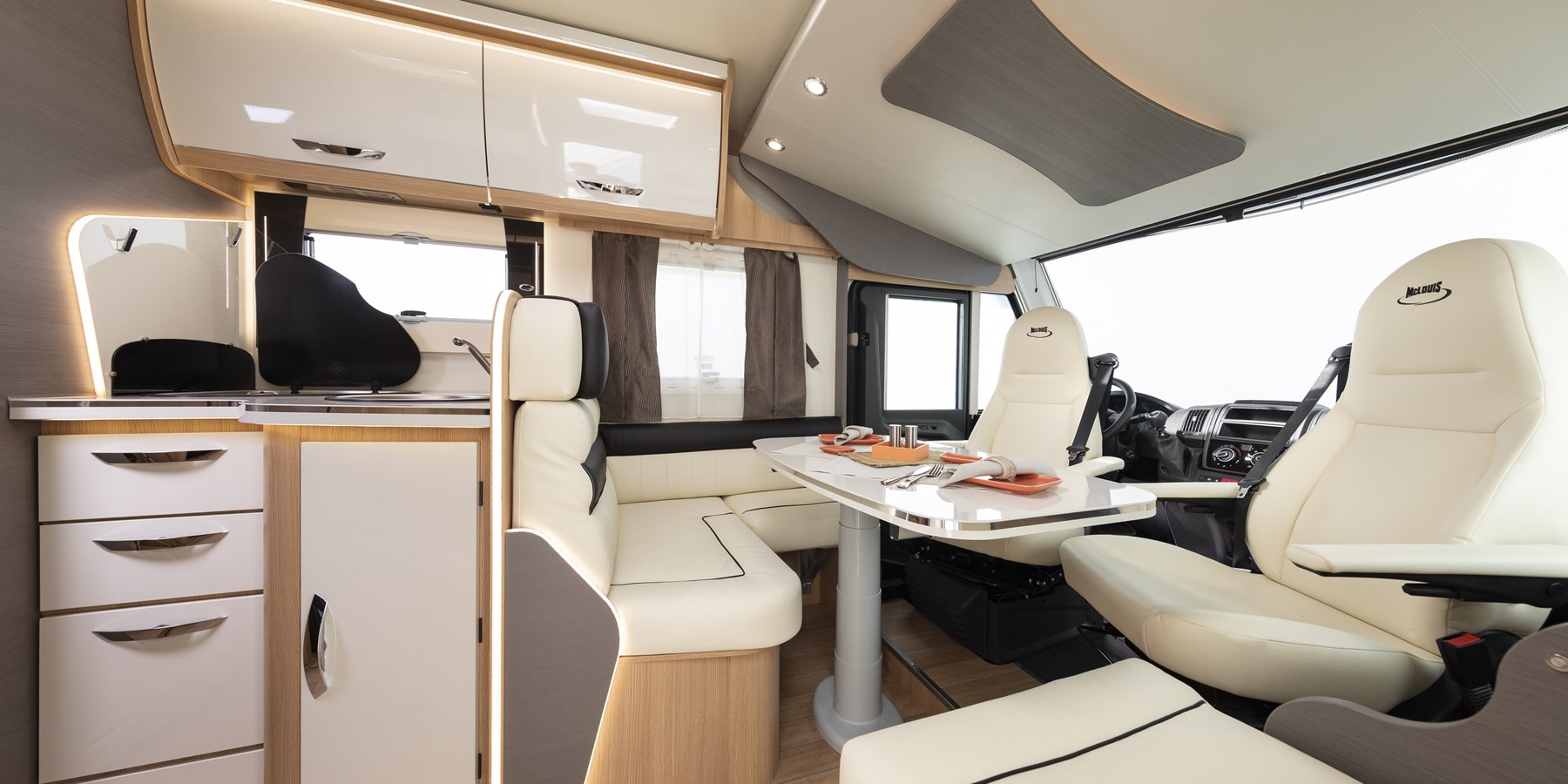 Motorhome McLouis Nevis 379, meccanica Fiat Ducato 2.3, 150 hp. Il Motorhome McLouis Nevis 379 ha un letto matrimoniale posteriore nautico e un letto matrimoniale basculante sulla cabina di guida e un’ampia dinette.