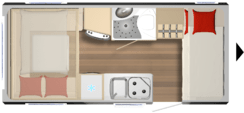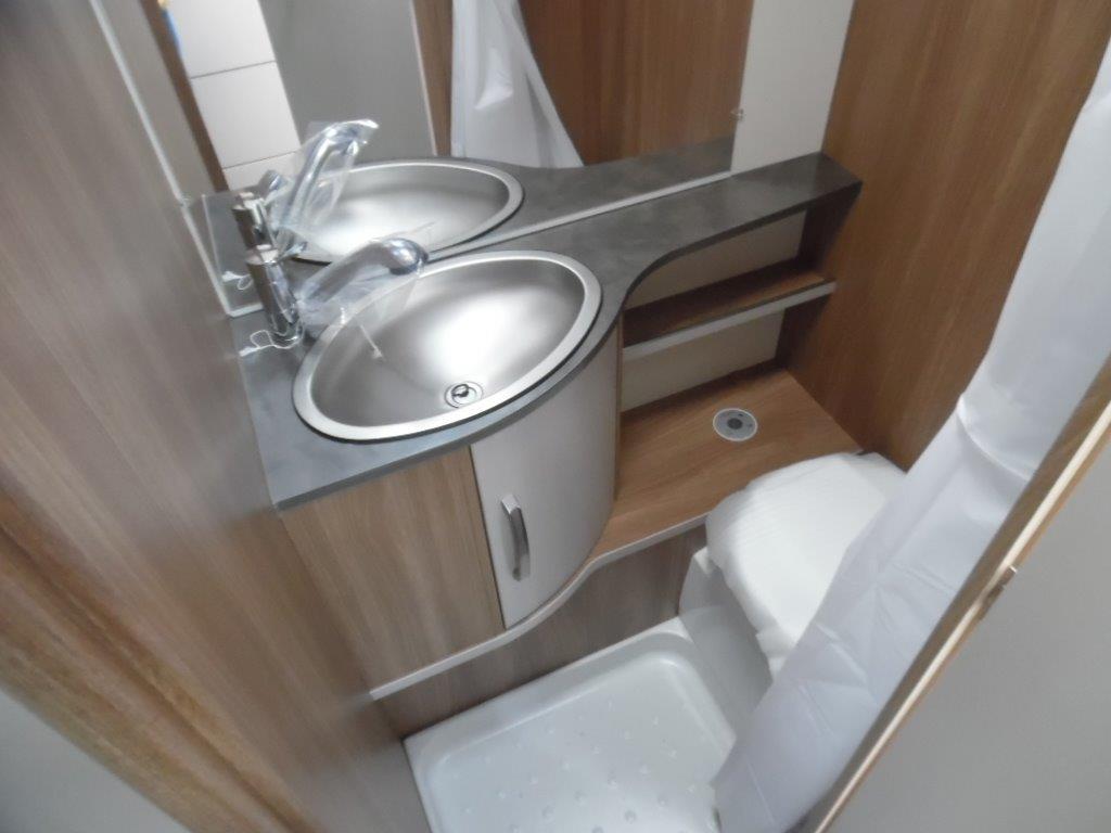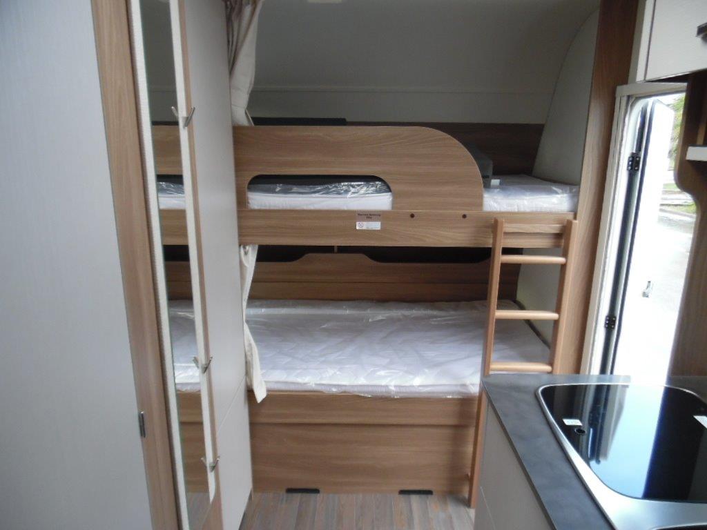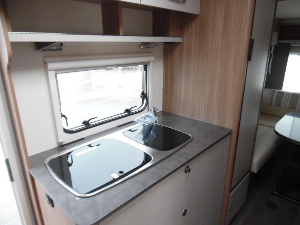 Bürstner Premio Plus 440, 6 posti con letto matrimoniale basculante sopra la dinette. La caravan è molto luminosa e compatta, si presta in maniera ottimale sia per vacanze non stanziali sia per campeggio.