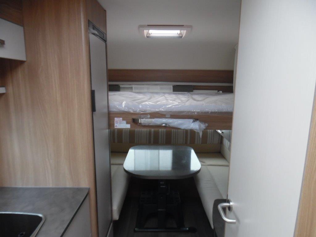 Bürstner Premio Plus 440: la dinette circolare, anch’essa trasformabile in un letto matrimoniale, è molto ampia e confortevole. Completa la dotazione di posti letto un letto a castello con due posti, con finestra.