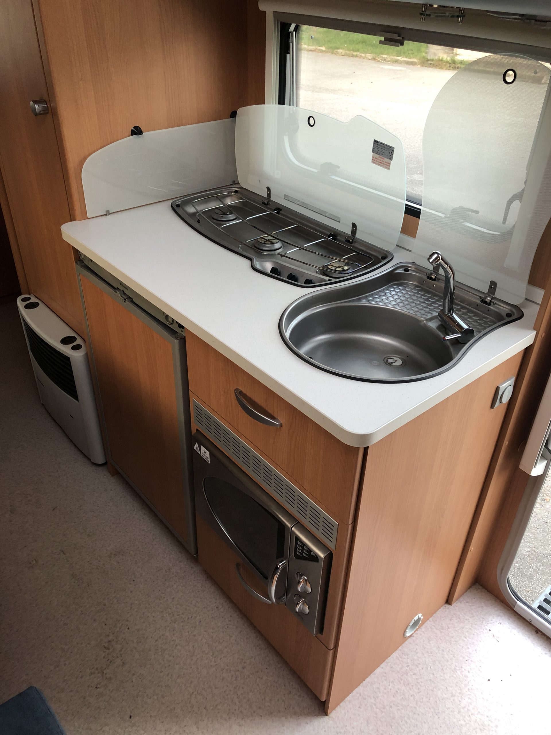 La cucina è dotta di forno a microonde, n. 3 fuochi, lavello e frigorifero trivalente da circa 80 litri con vano ghiacciaia.