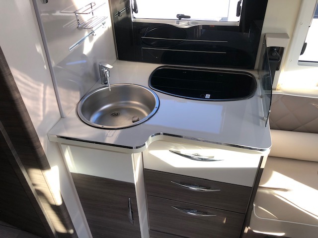 La cucina ha un frigorifero trivalente con doppia porta frigo e freezer, piano cucina con 3 fuochi, un comodo lavello ed uno spazio di stivaggio molto ampio.