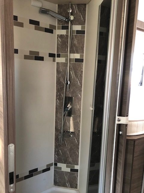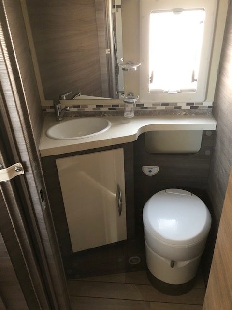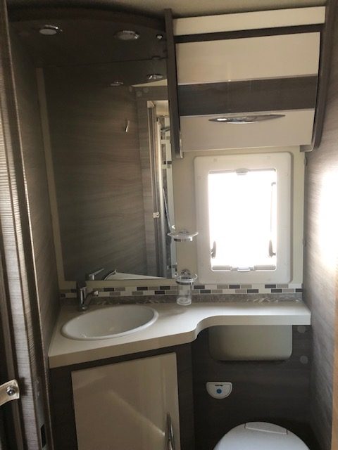 Il bagno e situato al centro del veicolo, il vano wc toilette è con mobilio premium è molto ampio ed ha un doppio volume per il piatto doccia. Chiudendo le porte intermedie del veicolo il bagno diventa un volume unico trasversale a tutta la larghezza del veicolo.